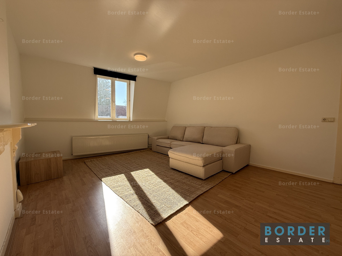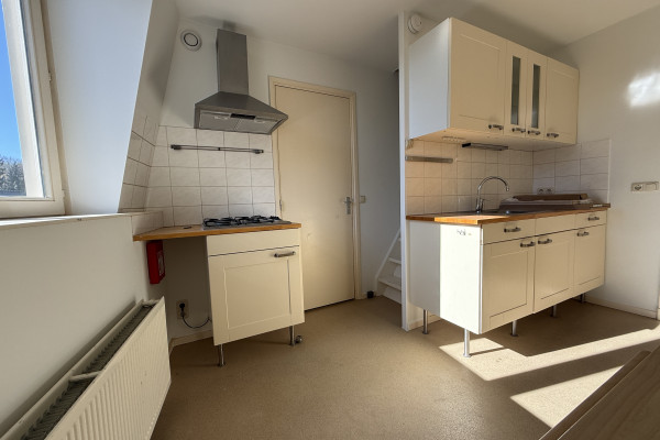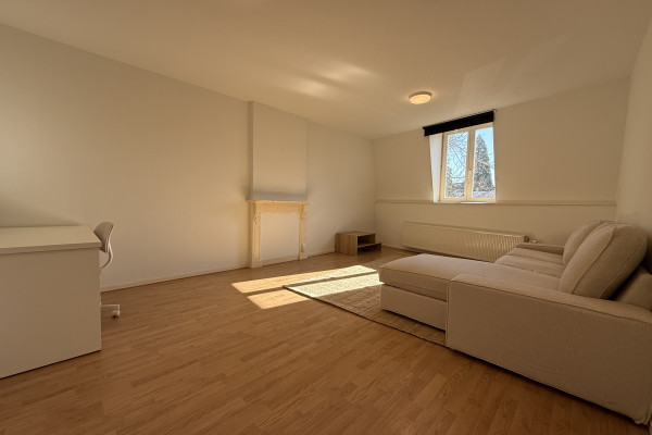 De woonkamer is heerlijk licht dankzij de grote raampartijen en de warme houten vloer geeft de ruimte direct een fijne uitstraling. De comfortabele hoekbank en het rustige interieur zorgen voor een plek waar je echt kunt ontspannen, terwijl er ook een praktische werkplek is ingericht voor wie regelmatig thuiswerkt. De keuken is netjes en compleet, met voldoende kastruimte en een gezellige plek om te eten bij het raam. Ook hier valt het daglicht mooi naar binnen.