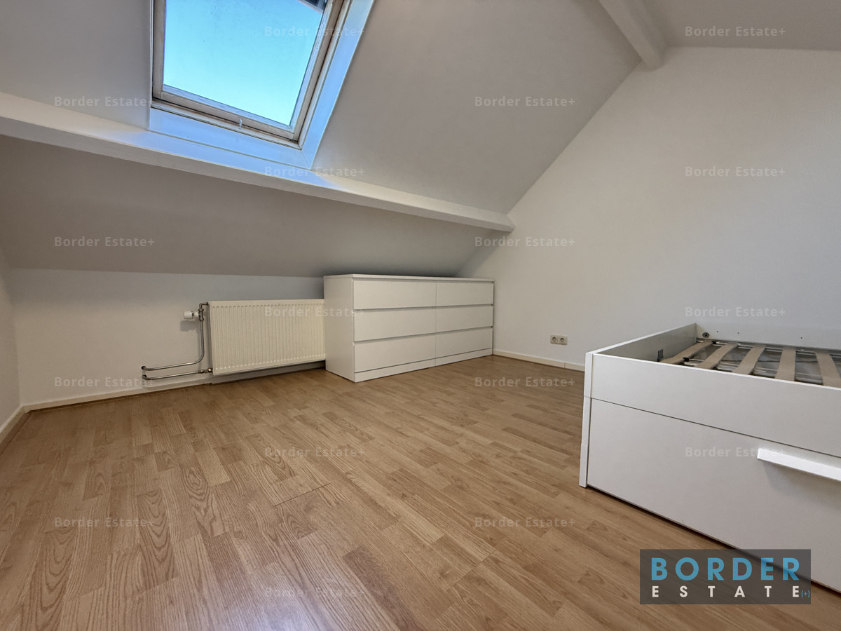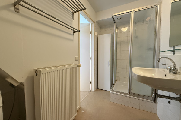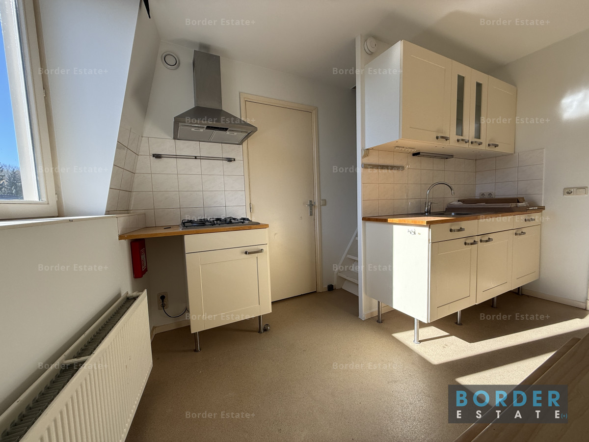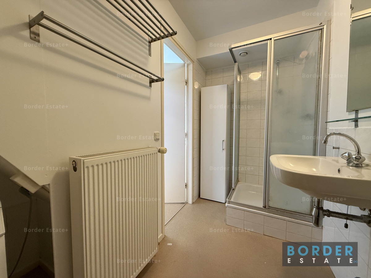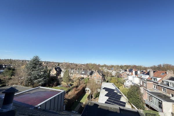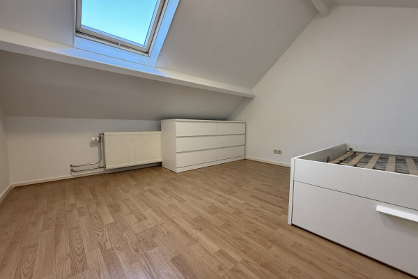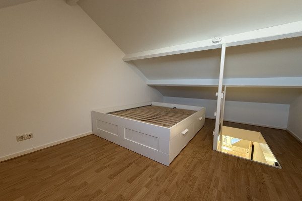 De slaapruimte bevindt zich op de vide en geeft het appartement een speels en knus karakter. Het is een fijne, rustige plek om je terug te trekken na een lange dag. Vanuit de woning kijk je uit over de charmante bebouwing en het groen van de omgeving, wat het gevoel van wonen in Sint-Pieter extra bijzonder maakt.