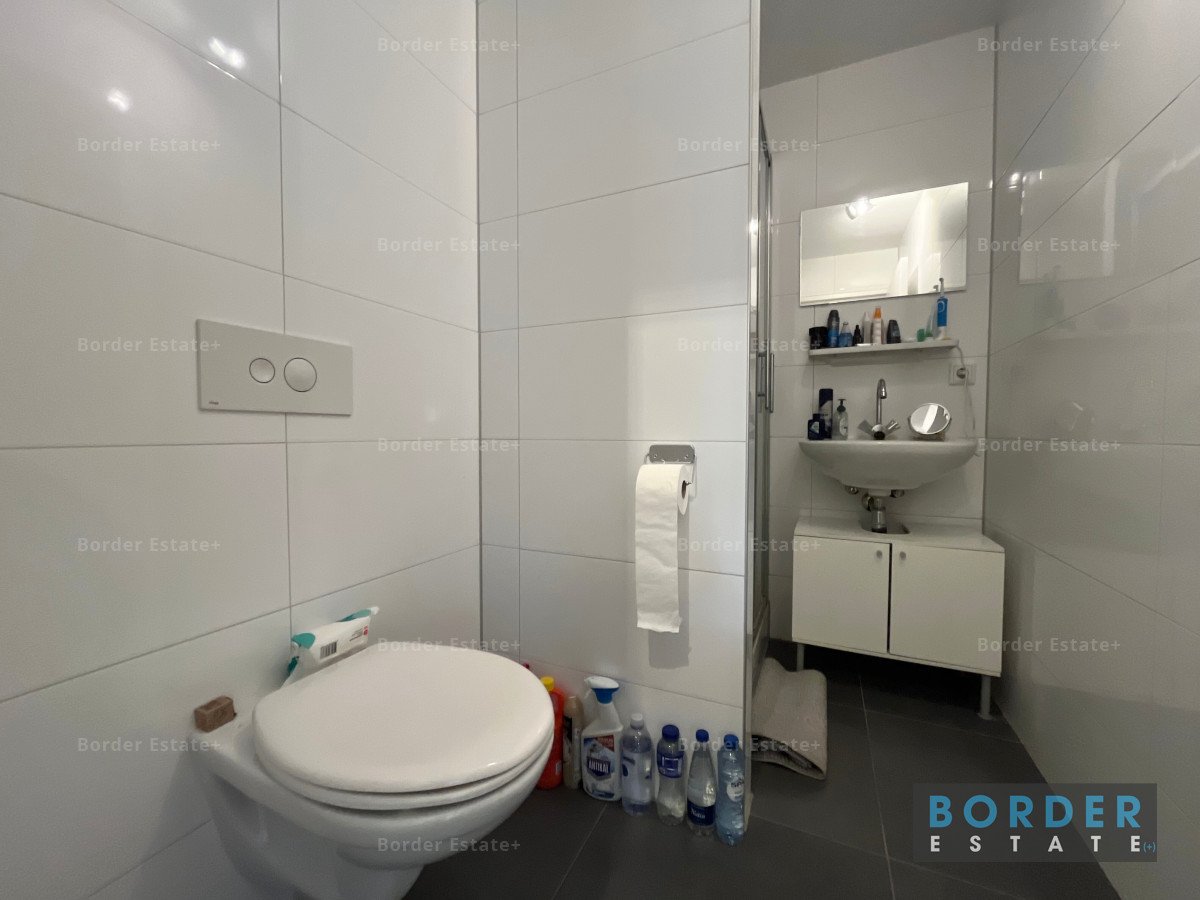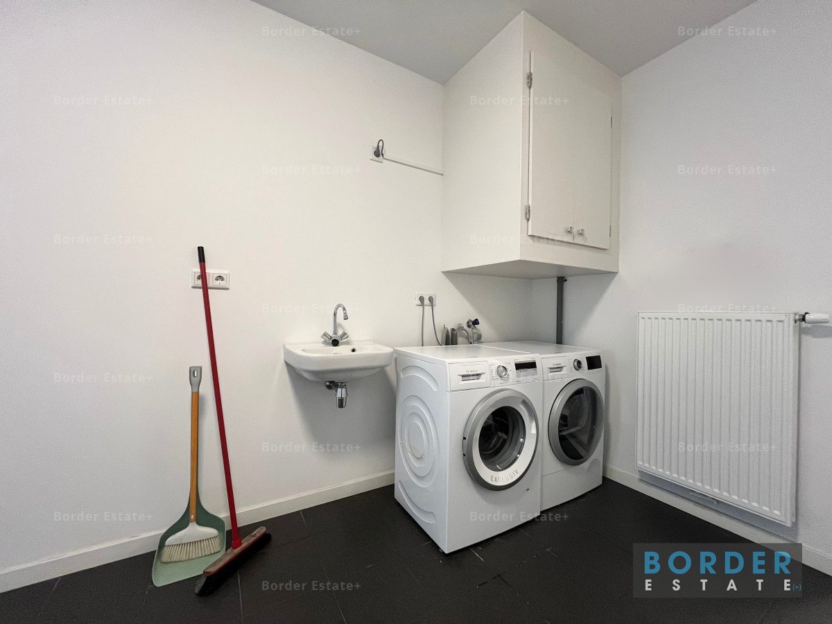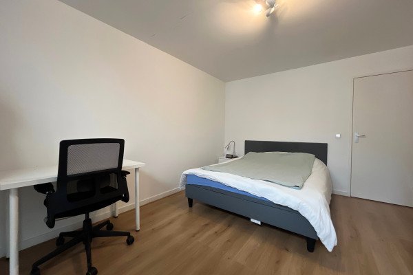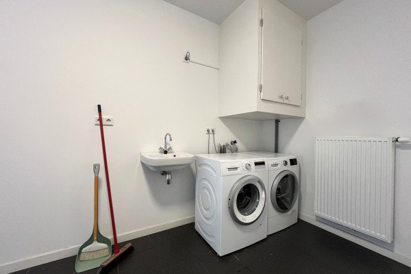 De slaapkamer is verrassend ruim en rustig gelegen, wat zorgt voor een fijne nachtrust. Er is voldoende plek voor een groot tweepersoonsbed, kledingkast en eventueel een extra opbergmeubel. De moderne badkamer is volledig betegeld en voorzien van een nette douche, wastafel en toilet – helemaal klaar voor dagelijks comfort. Daarnaast is er een aparte wasruimte, ideaal voor het plaatsen van een wasmachine en droger, zodat alles netjes uit het zicht blijft.