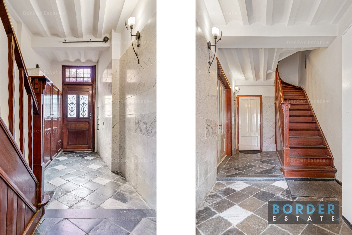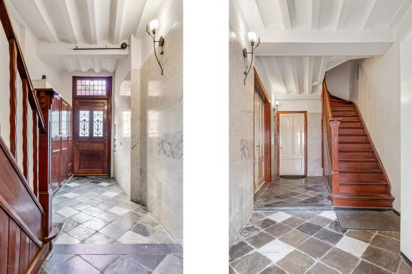 De gezamenlijke entree ademt historie, met natuurstenen vloeren, een houten trap en authentieke details.