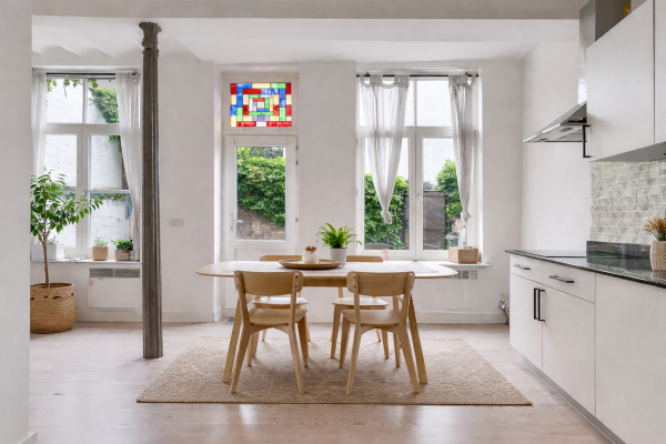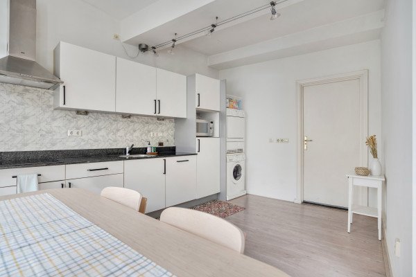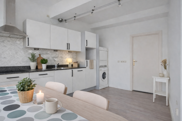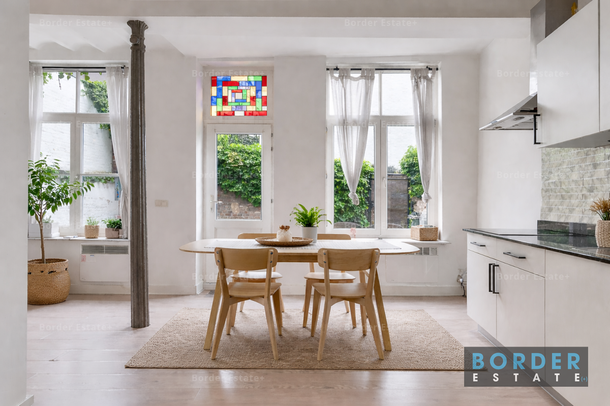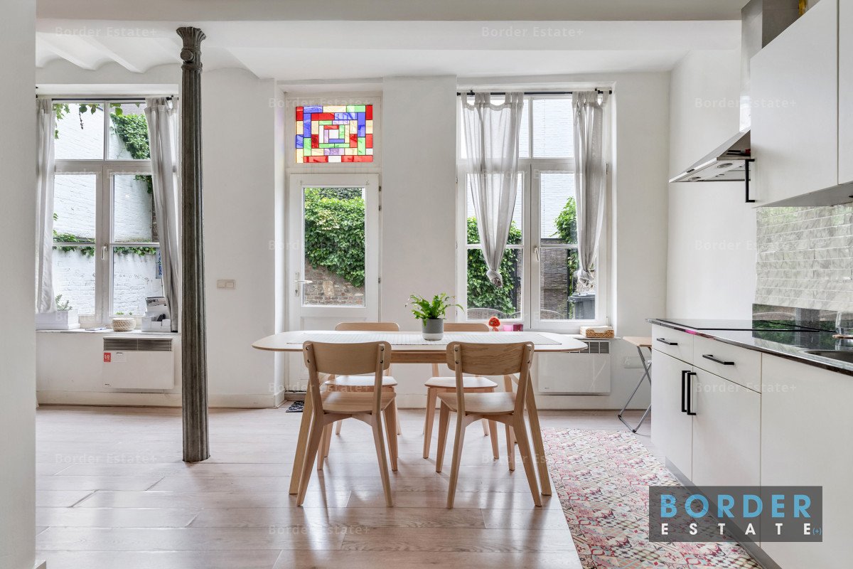 In het appartement zelf vallen de lichtinval en de ruimtelijkheid direct op. De woonkamer vormt het hart van de woning, met voldoende plaats voor een zit- en werkhoek. Vanuit hier bereikt u de eetkamer, die dankzij de grote ramen en de openslaande deuren een directe verbinding heeft met de tuin. Aansluitend bevindt zich de keuken, praktisch en modern ingericht, zodat koken en tafelen naadloos samenkomen.