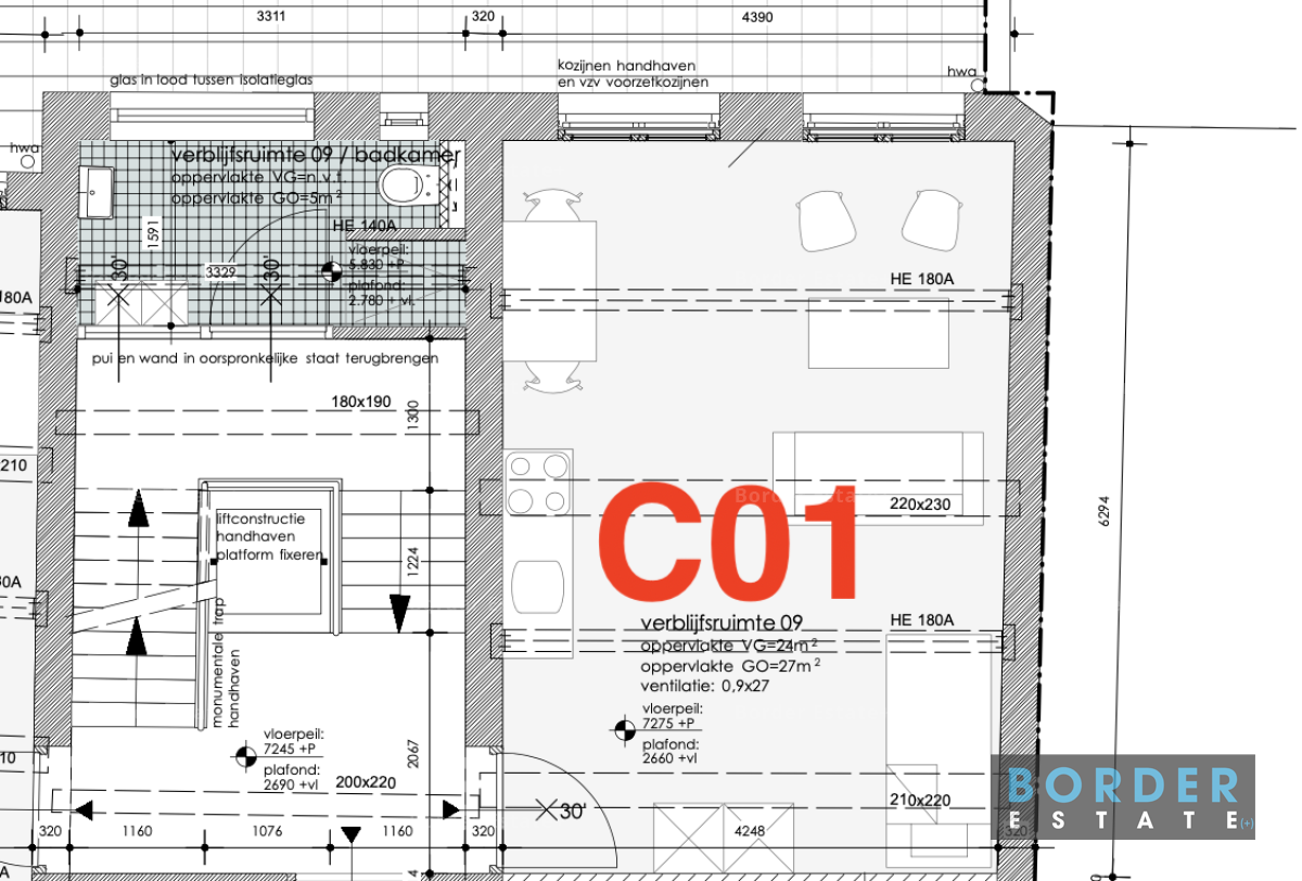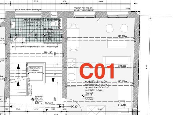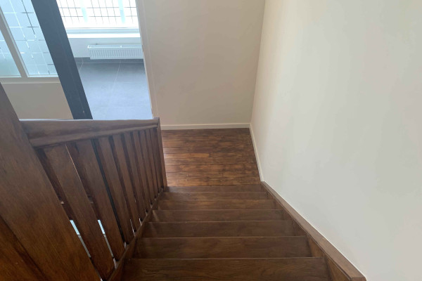 De studio (ca. 27 m²) bevindt zich op de tweede verdieping en beschikt over een lichte woon-/slaapruimte met grote raampartijen en een moderne open keuken, voorzien van o.a. vaatwasser, 4-pits elektrische kookplaat met oven, koelkast met vriesvak en afzuigkap.