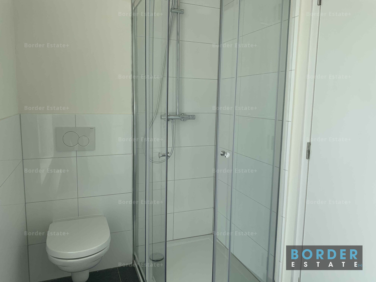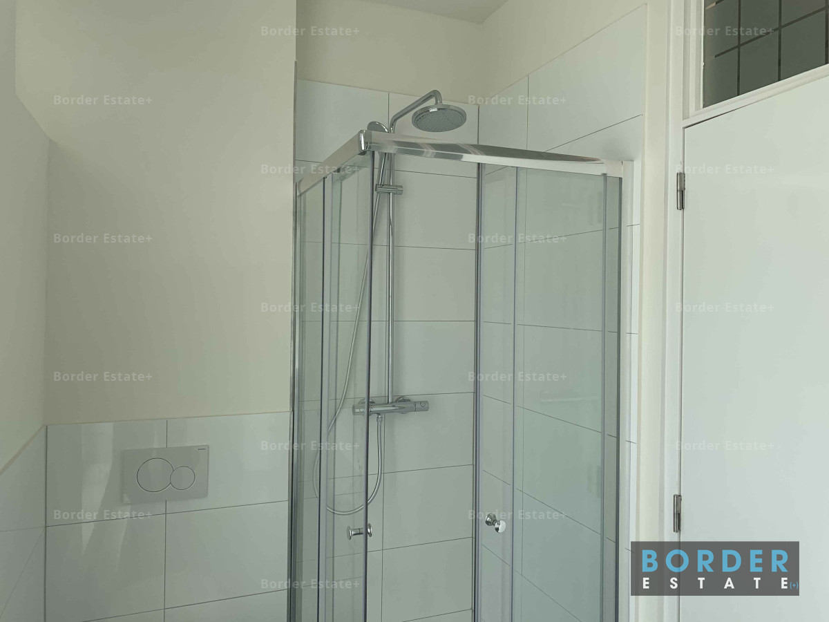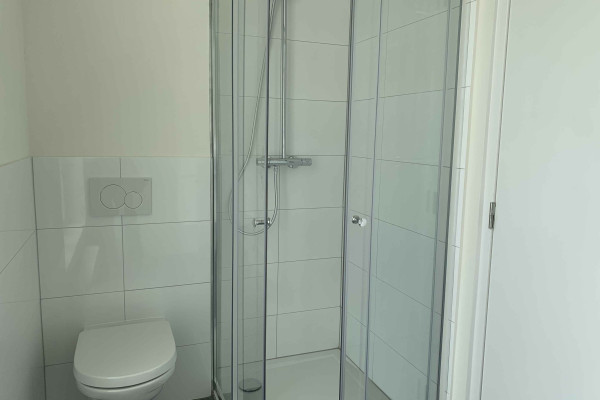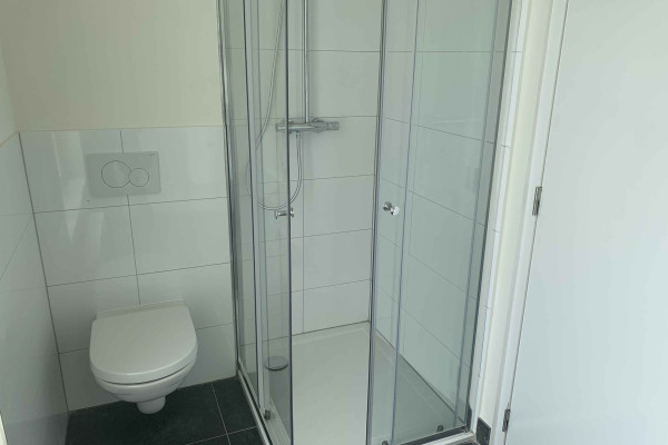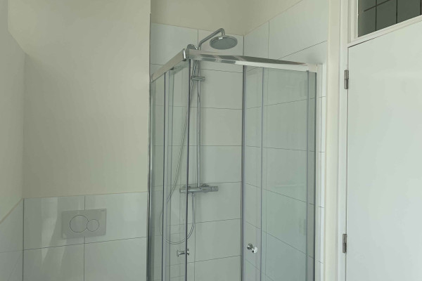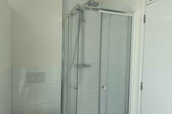 De privébadkamer (ca. 5 m²) is recent vernieuwd en uitgerust met douche, toilet, wastafel en wasmachineaansluiting.