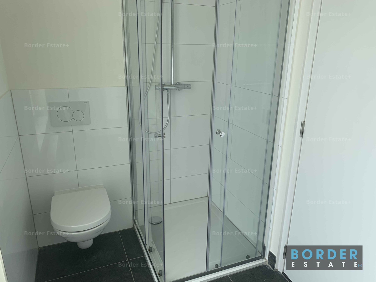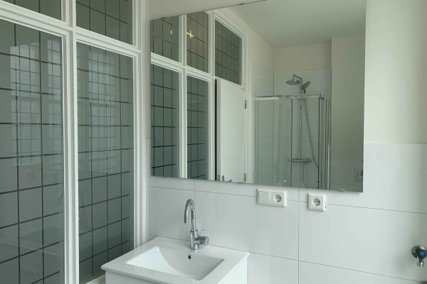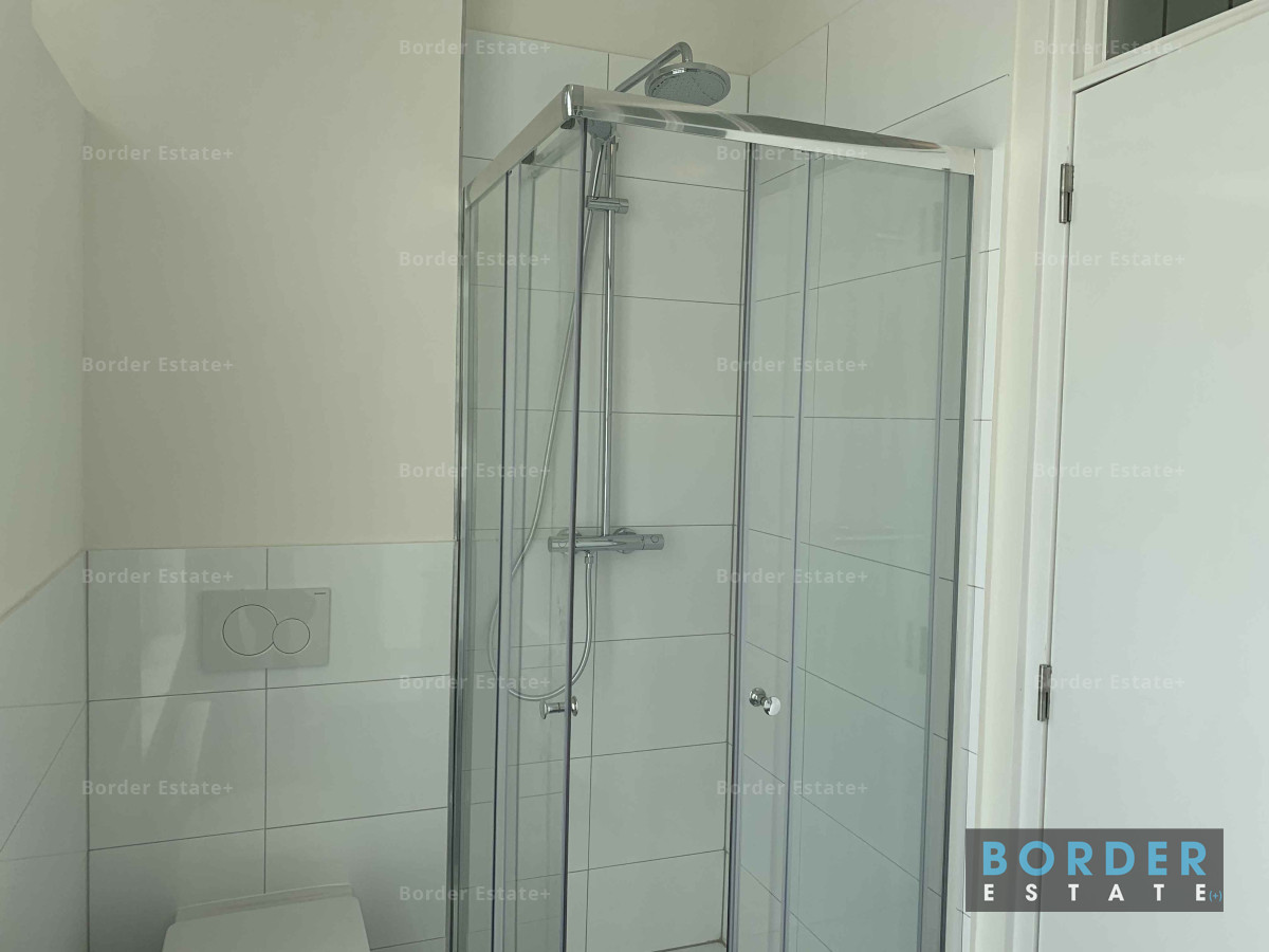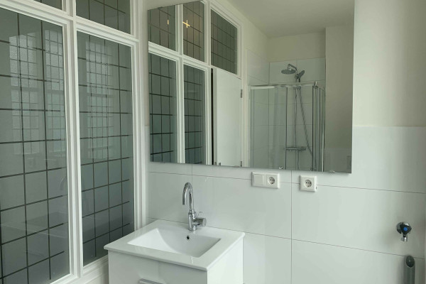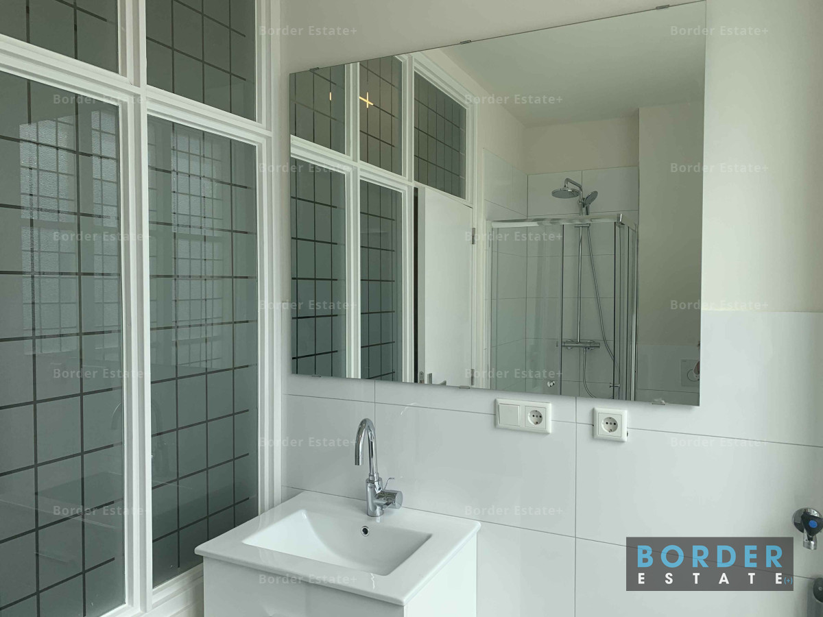 De privébadkamer (ca. 5 m²) is recent vernieuwd en uitgerust met douche, toilet, wastafel en wasmachineaansluiting.