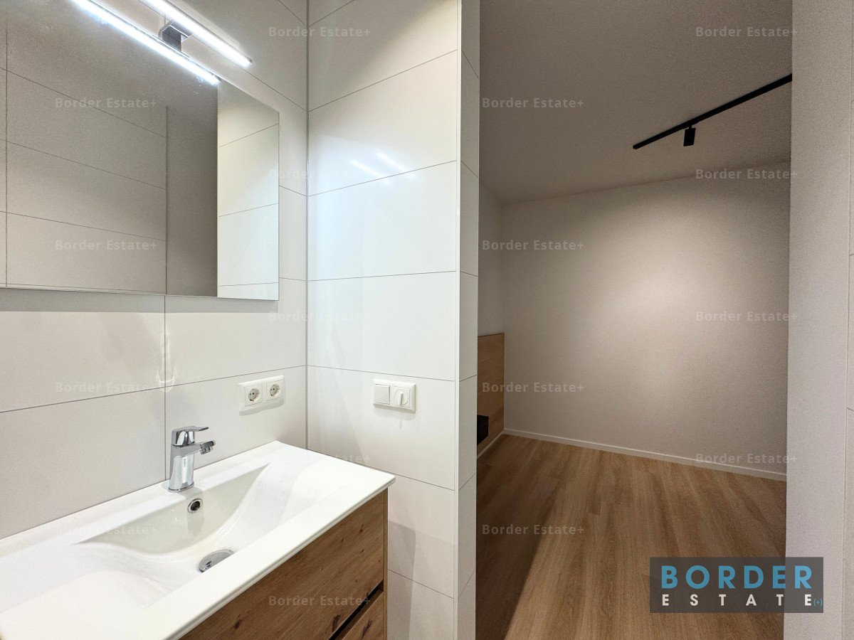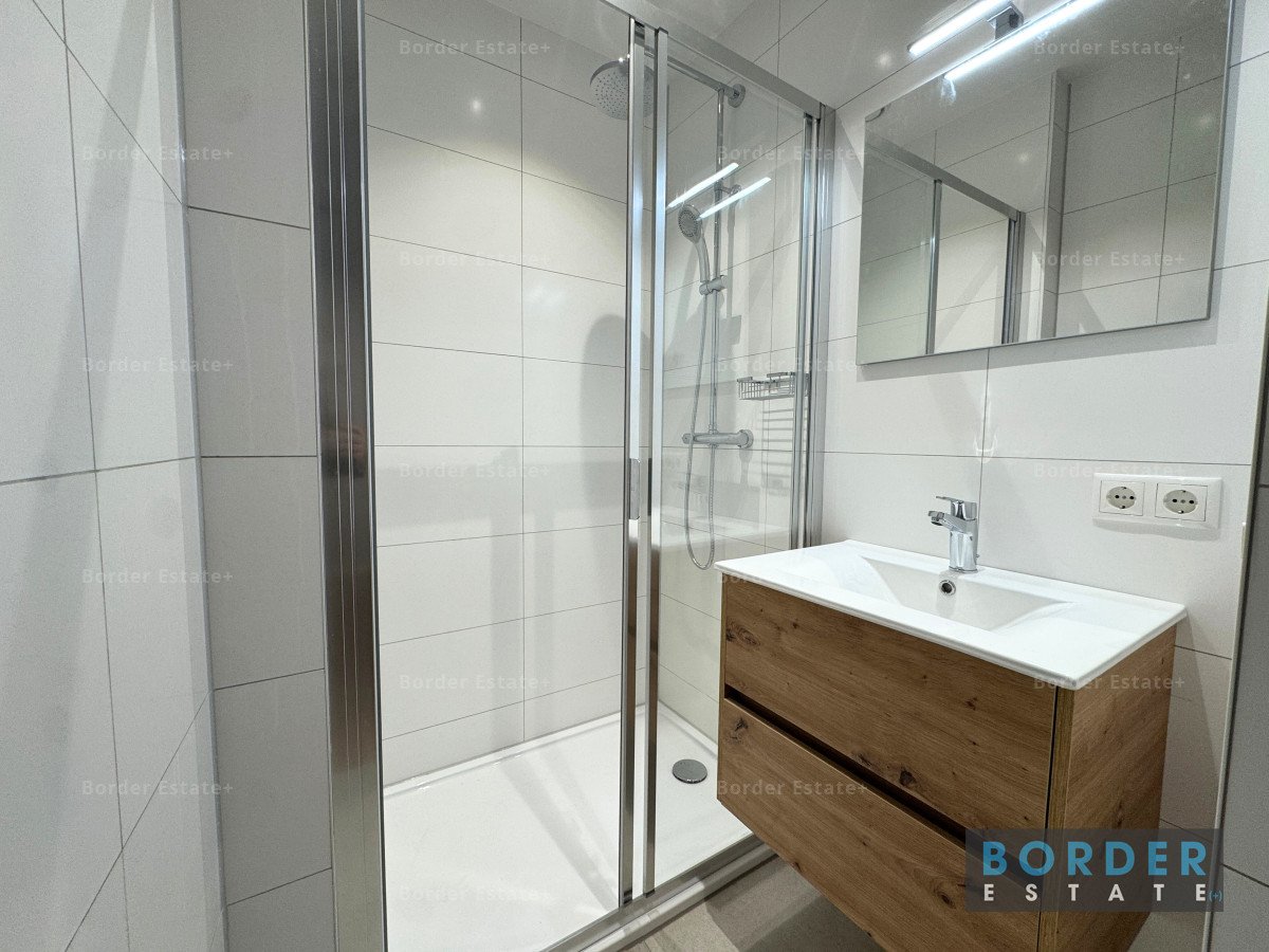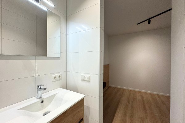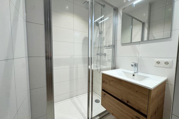 De badkamer is nieuw en beschikt over een ruime douche met glazen deur, een wastafelladekast met wasbak en verlichte spiegel, dubbel stopcontact, en inbouwspots. Het aparte toilet heeft een wastafelkastje met fontein.