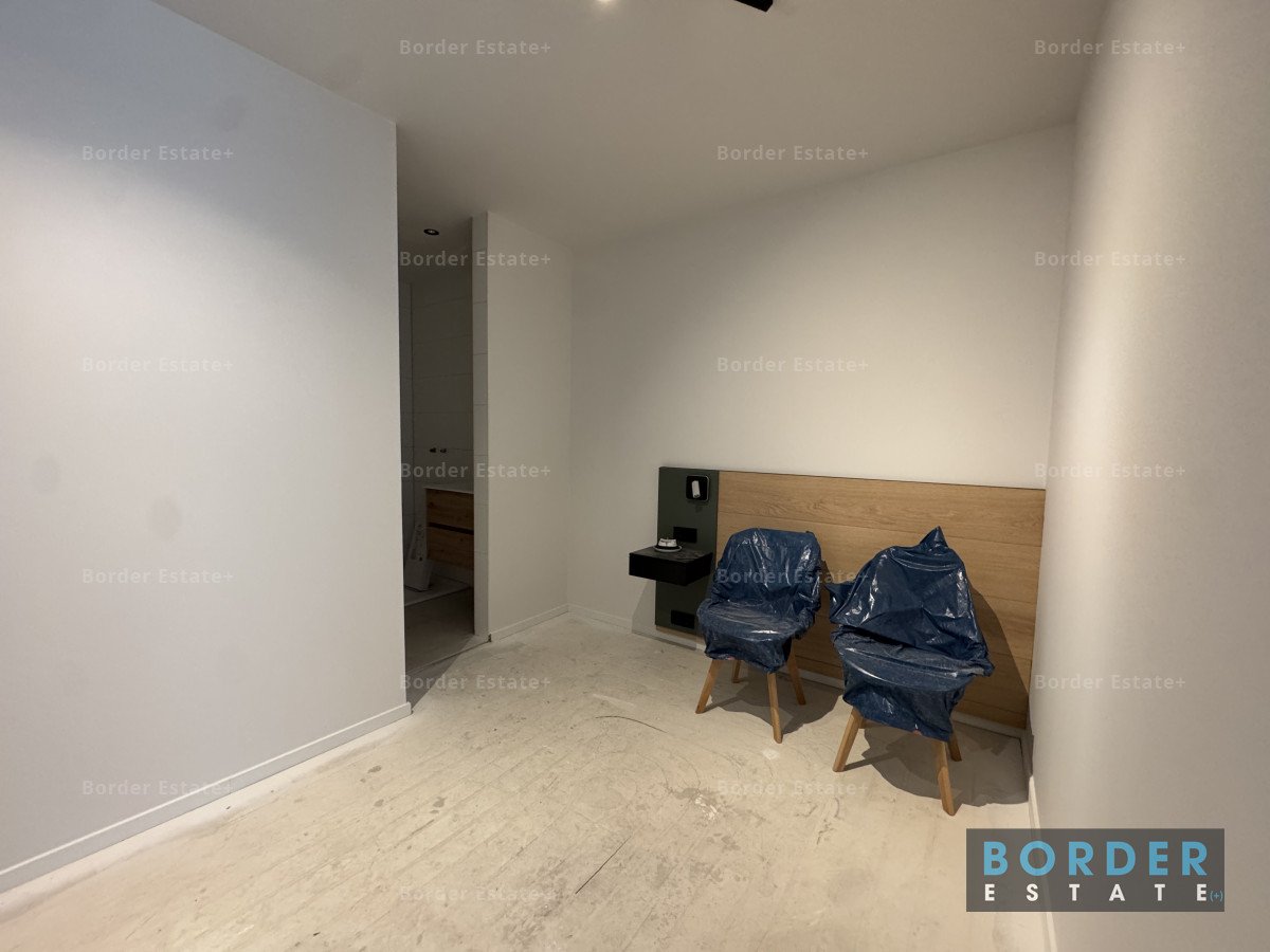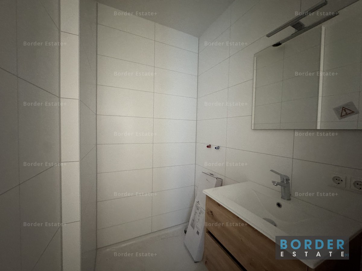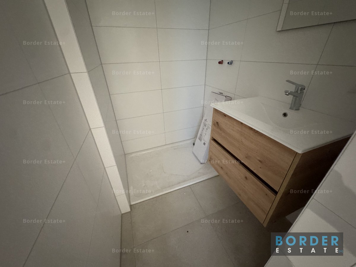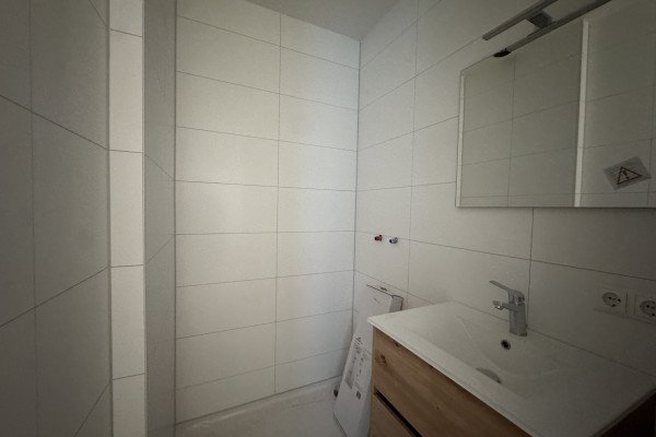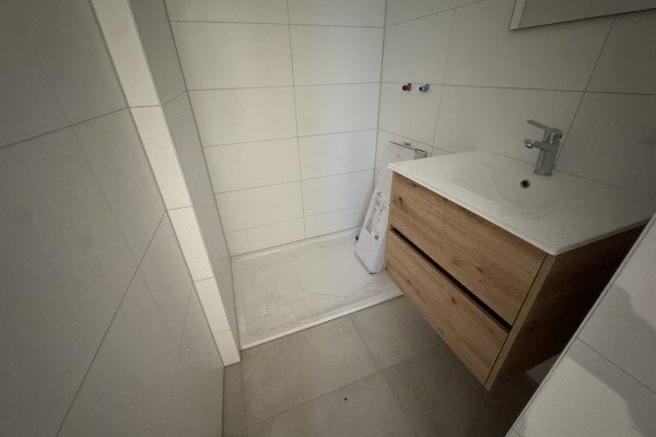 De badkamer is nieuw en beschikt over een ruime douche met glazen deur, wastafelladekast met wasbak en verlichte spiegel, dubbel stopcontact, en inbouwspots.