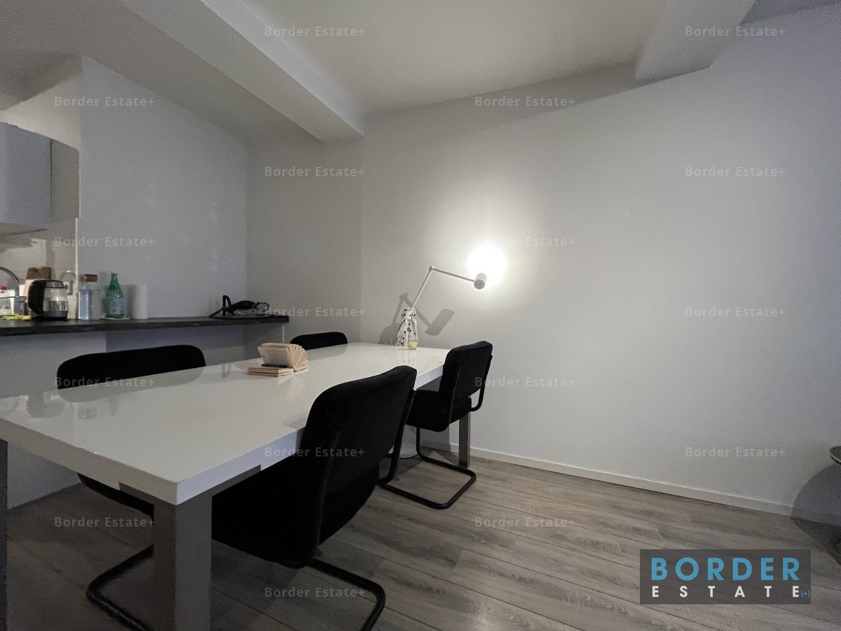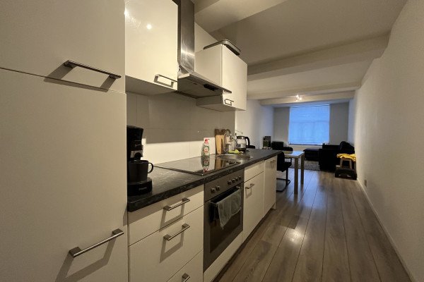 The open-plan kitchen is efficiently designed and equipped with built-in appliances, including a cooktop, oven, extractor hood, and refrigerator. There is sufficient space for a dining table or home office setup.
