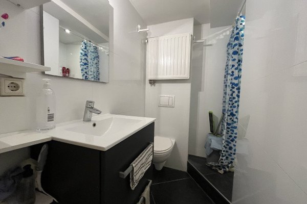 The bedroom is quietly situated and offers enough room for a double bed and wardrobes. The bathroom is modern and well maintained, featuring a walk-in shower, washbasin, and toilet.