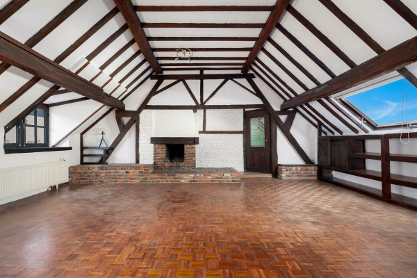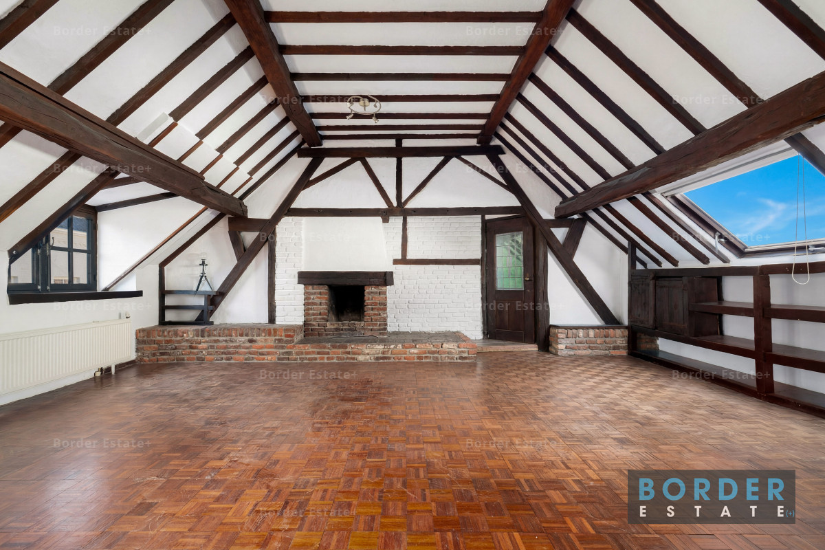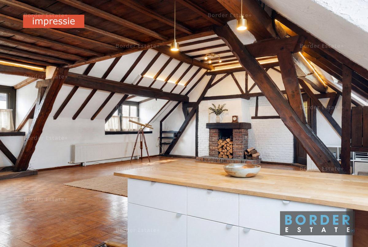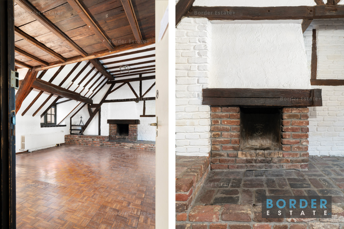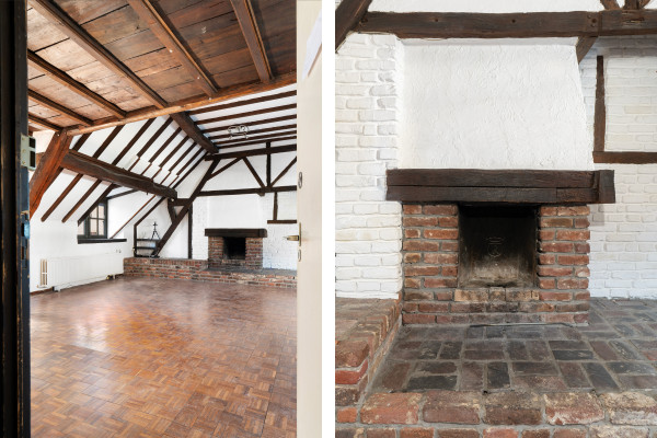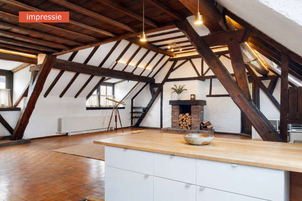 The spacious living room forms the heart of the home. The open roof structure, exposed wooden beams and playful layout create a true loft-style atmosphere full of character. The authentic fireplace serves as a central and inviting feature within the space.