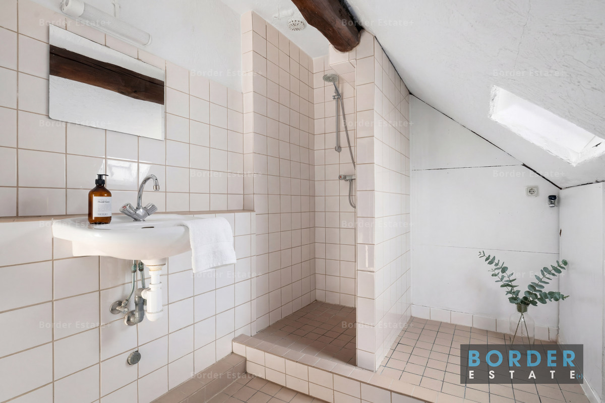 The open kitchen is simple in its current form and offers the opportunity to be redesigned and modernised according to your own preferences. Its open layout maintains a pleasant connection with the living area.