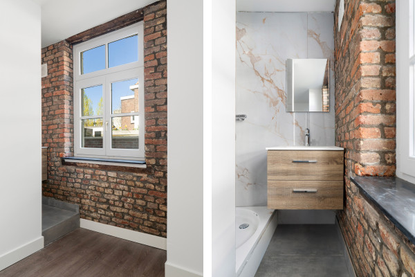 The living room with open-plan kitchen forms the central living area. The combination of high ceilings, large windows and authentic elements such as exposed brickwork and the fireplace gives this space a unique and inviting character. The living room offers ample space for a comfortable seating and dining area.