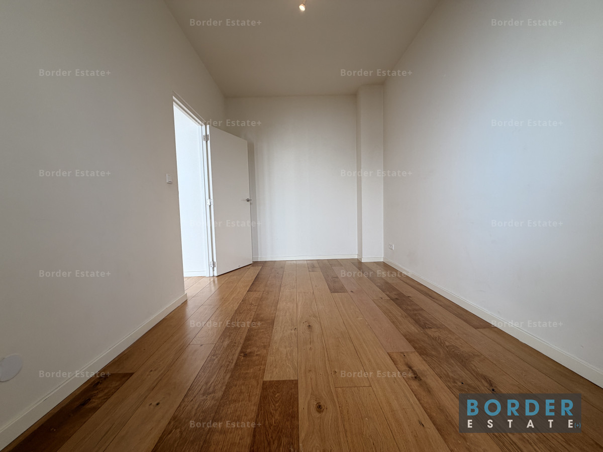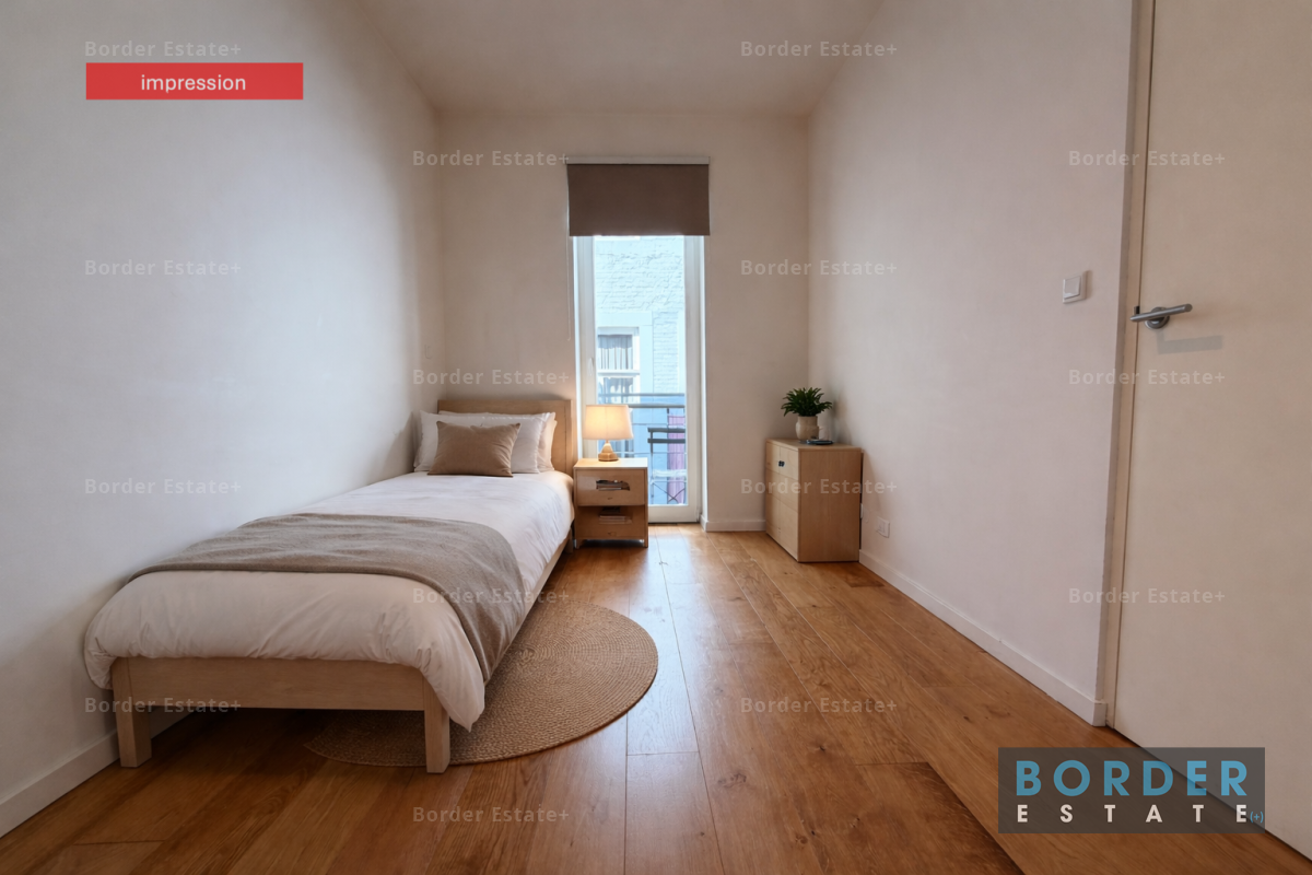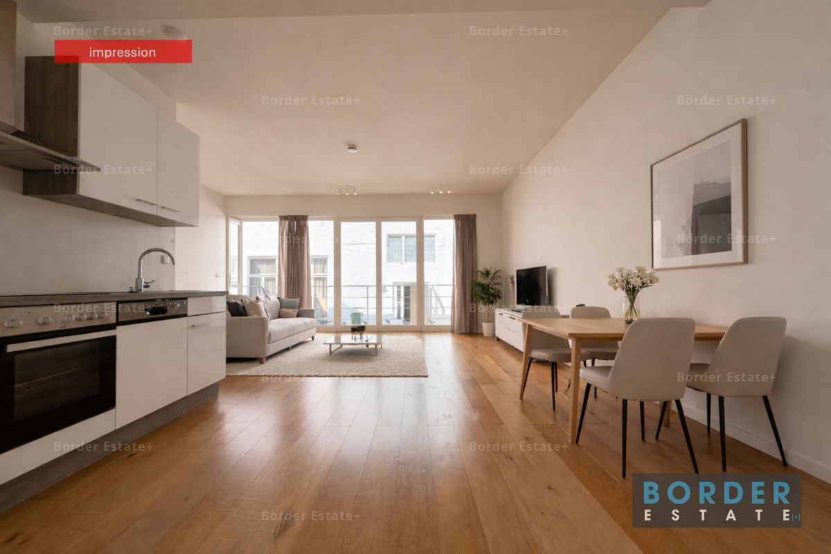 The apartment is situated on the ground floor and features a private balcony with access to the shared outdoor space—a rare luxury in the city center. You enter into a bright and spacious living area, where large windows provide plenty of natural light. The modern kitchen is sleek and fully equipped with all necessary built-in appliances—perfect for those who enjoy cooking.