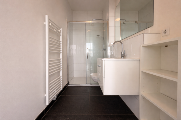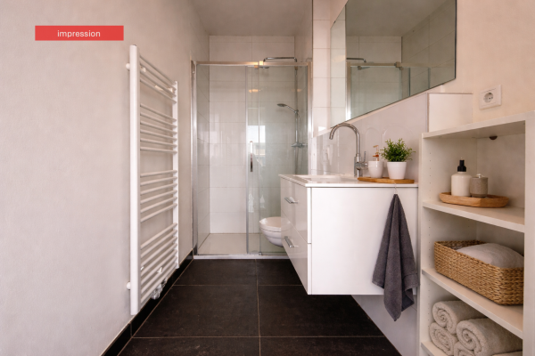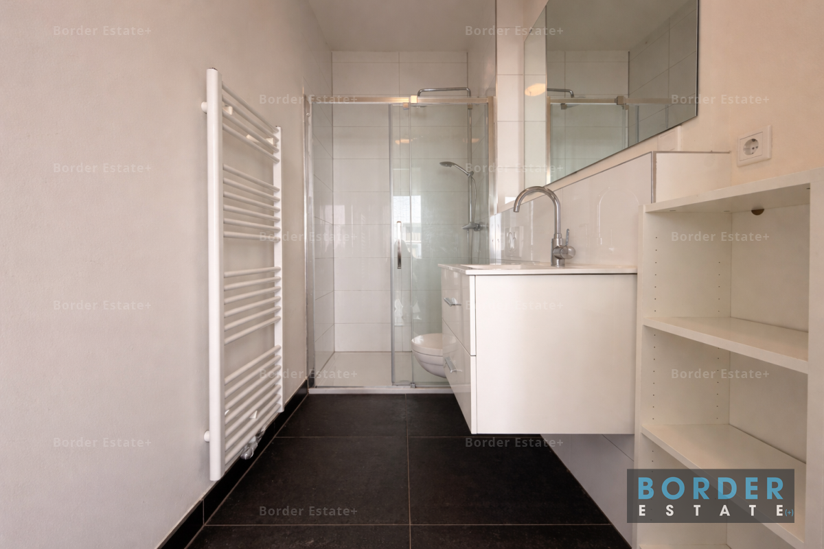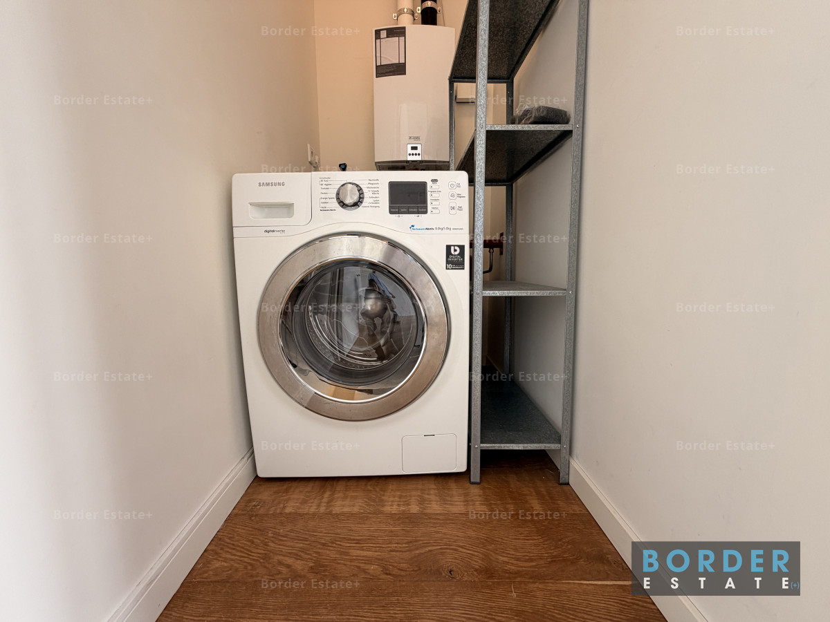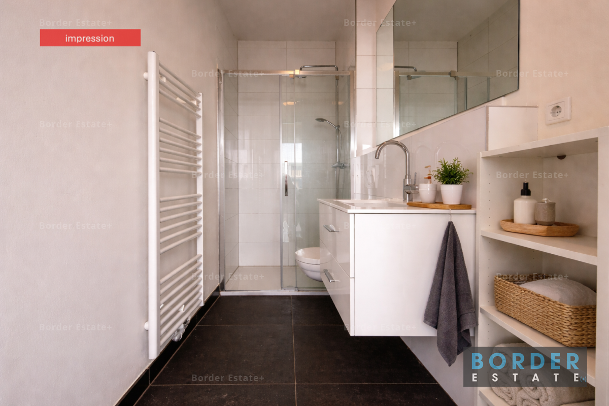 The bedroom is spacious and also wonderfully bright, with direct access to the balcony through a large door. The bathroom is practical and well-maintained, with a shower and washbasin, while the toilet is separate. There is also a convenient storage room within the apartment, with connections for a washing machine or dryer.