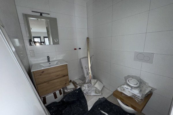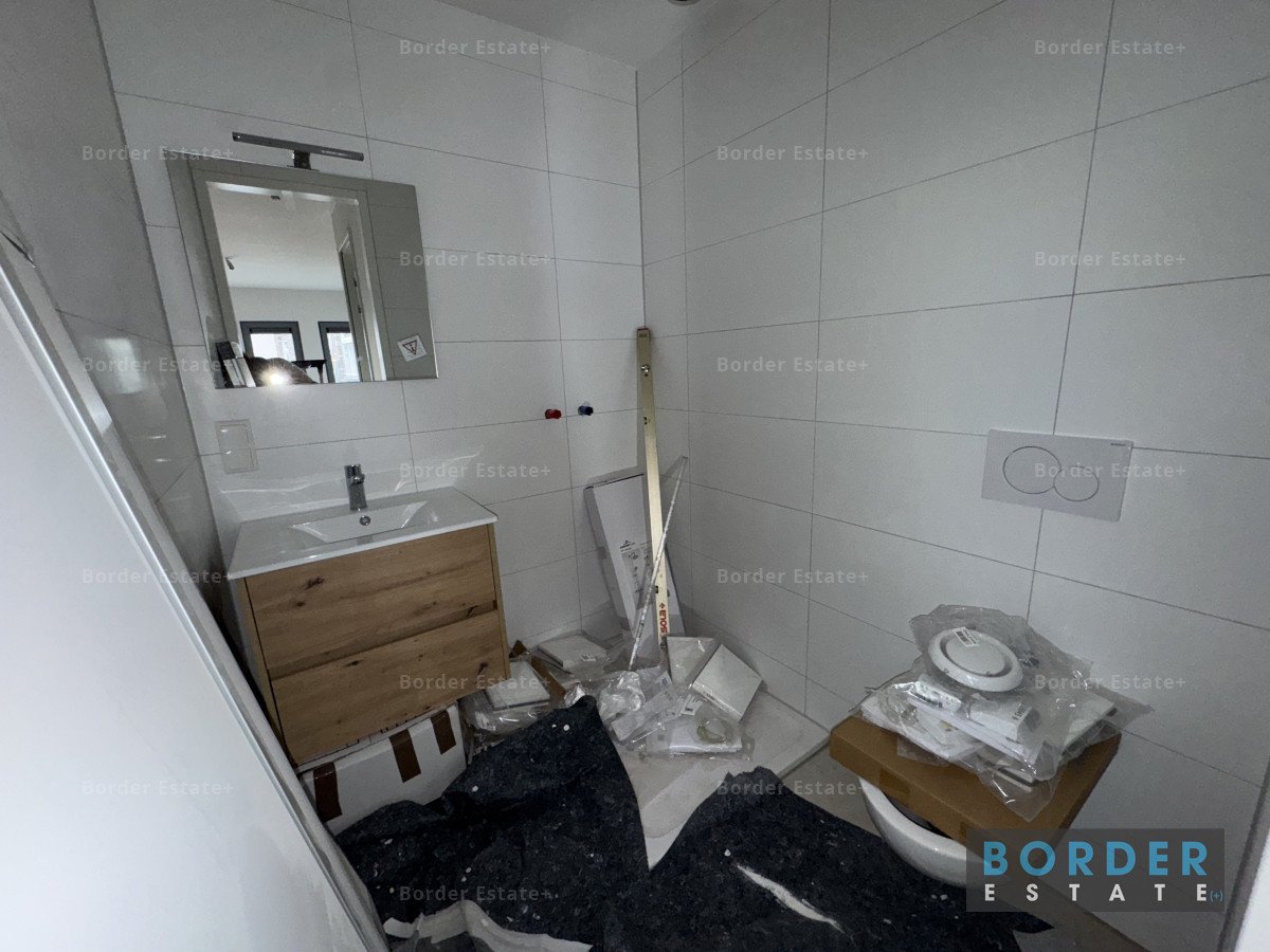 The bathroom is new and features a toilet, spacious shower with glass door, washbasin cabinet with illuminated mirror, double power socket, and built-in spotlights.