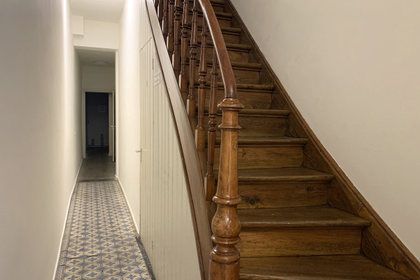 The apartment is situated in a characteristic, monumental building that adds to its authentic charm. Inside, you'll find a spacious and bright apartment with a very pleasant layout. The living room is generous in size and filled with natural light, enhanced by the light flooring and walls that create an open and airy feel.