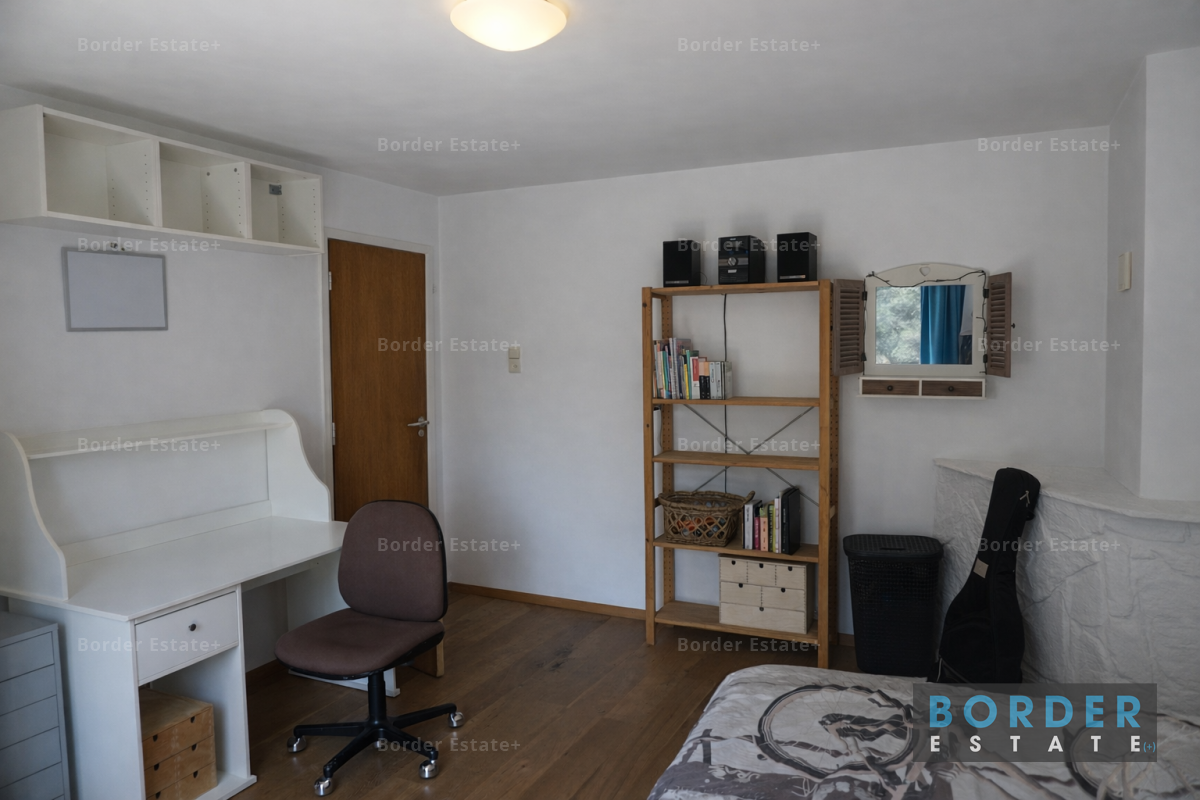 The property features a basement, garage, living room, dining room, fully equipped kitchen, separate toilet, bathroom with toilet, and four bedrooms. The modern kitchen is fully equipped with all conveniences, including a dishwasher, refrigerator, freezer, 5-burner gas stove, cooktop, and extractor hood. In addition, the house is fitted with central heating, ensuring comfortable living throughout the year.