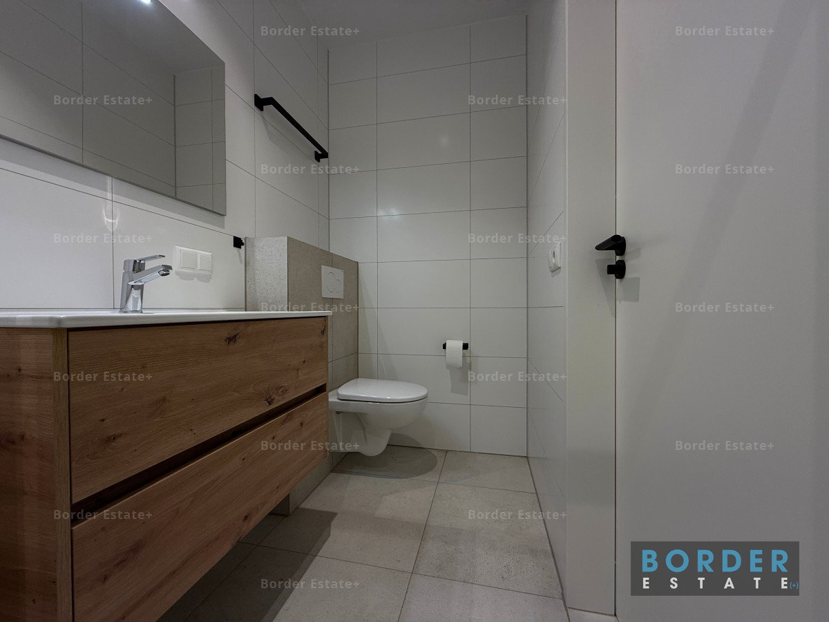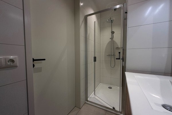 The modern bathroom is beautifully finished and fully equipped with all comforts. The spacious shower with glass door provides convenience and comfort, while the vanity unit with washbasin and illuminated mirror add a fresh, modern look. The bathroom also features a toilet, double power socket, and two built-in spotlights, creating a practical and well-designed space where comfort meets style.