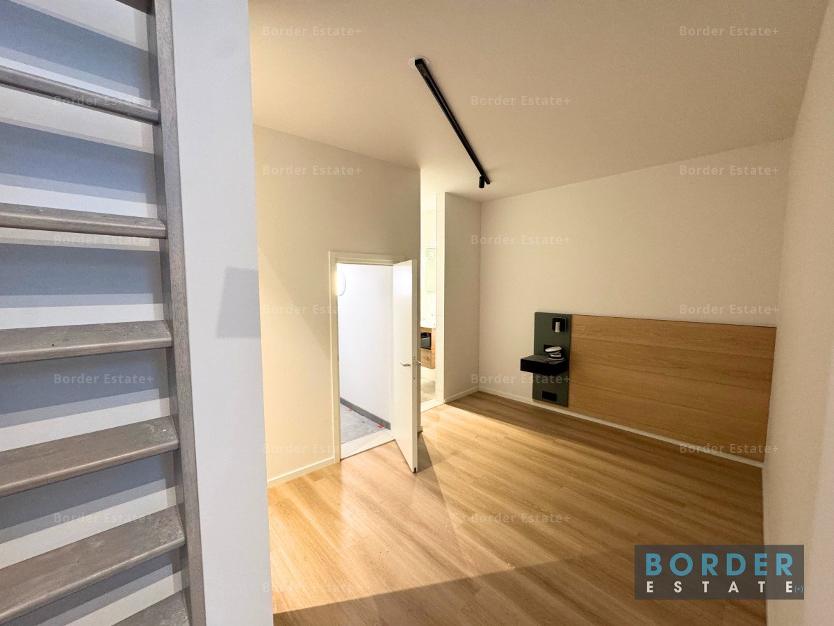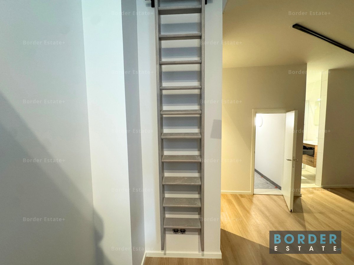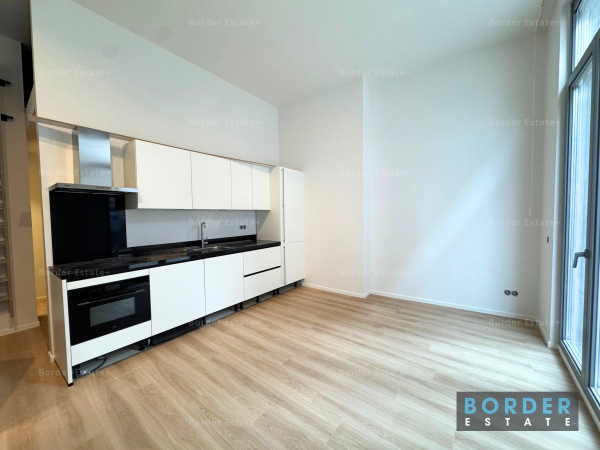 The apartment features underfloor heating throughout, triple glazing, two private solar panels, and has an A+++ energy label. The 3.5-meter ceiling height and private outdoor space create a bright and spacious atmosphere.