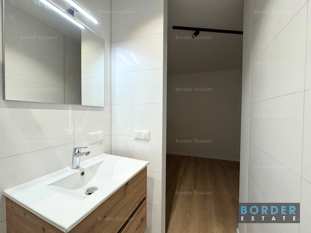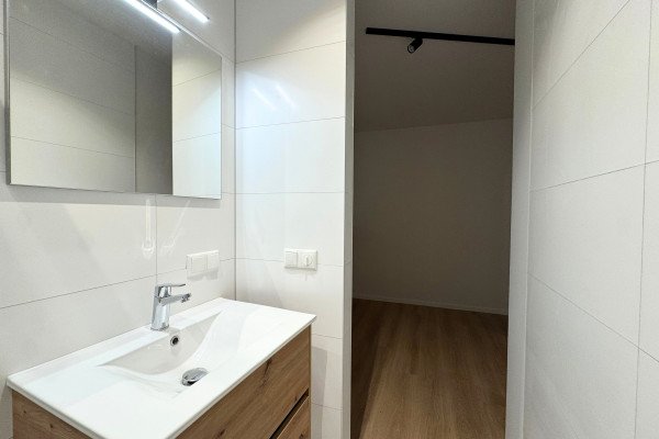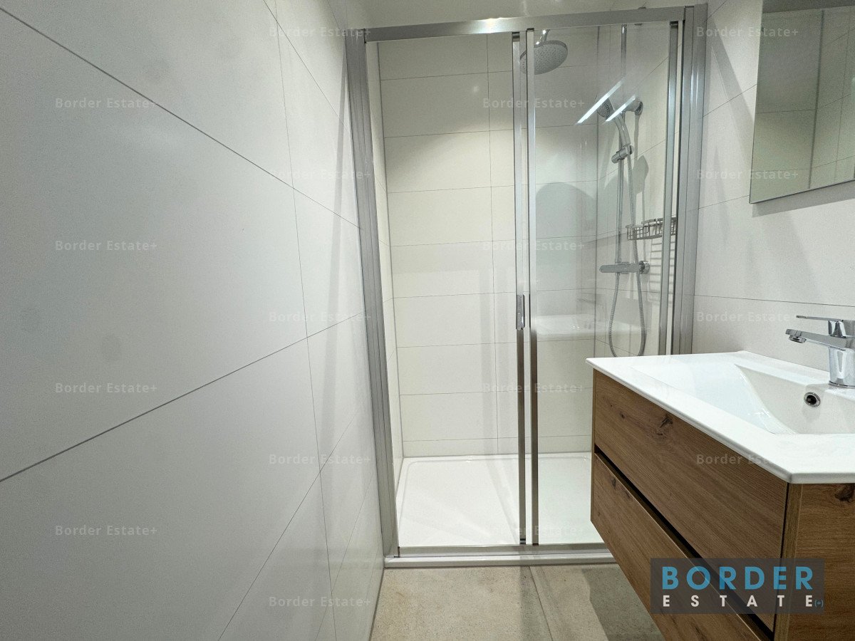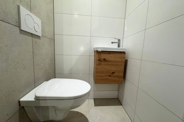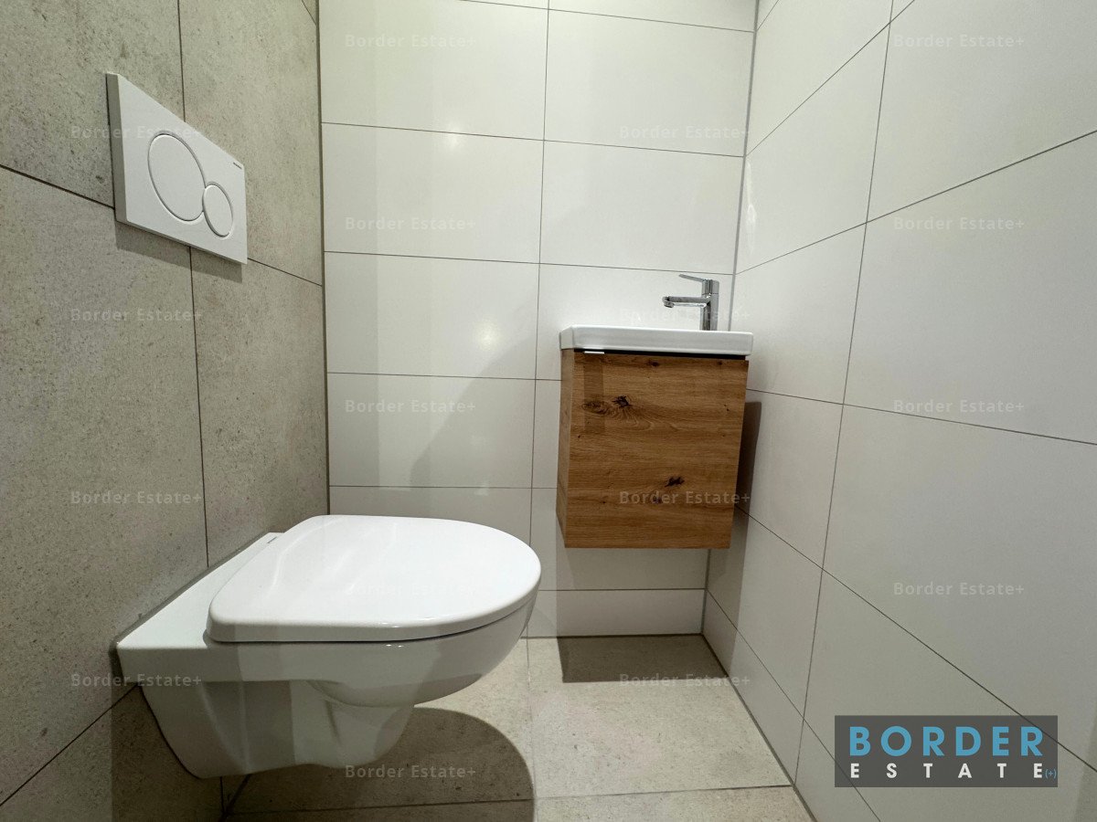 The bathroom is new and features a spacious shower with glass door, a washbasin cabinet with illuminated mirror, double power socket, and built-in spotlights. The separate toilet is equipped with a washbasin cabinet and fountain.