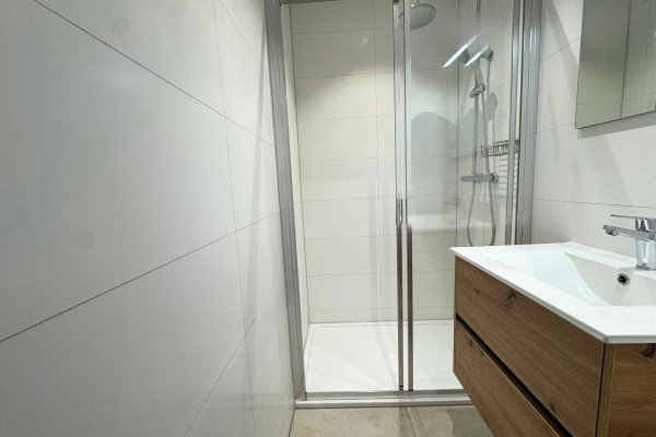 - Bathroom with spacious shower, illuminated mirror, built-in spotlights, and double socket