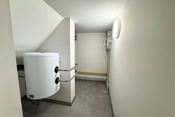 The technical room, accessible from the hallway, houses the heat pump and boiler.
