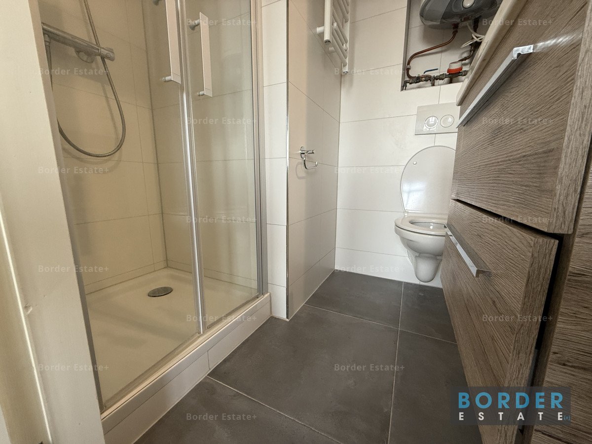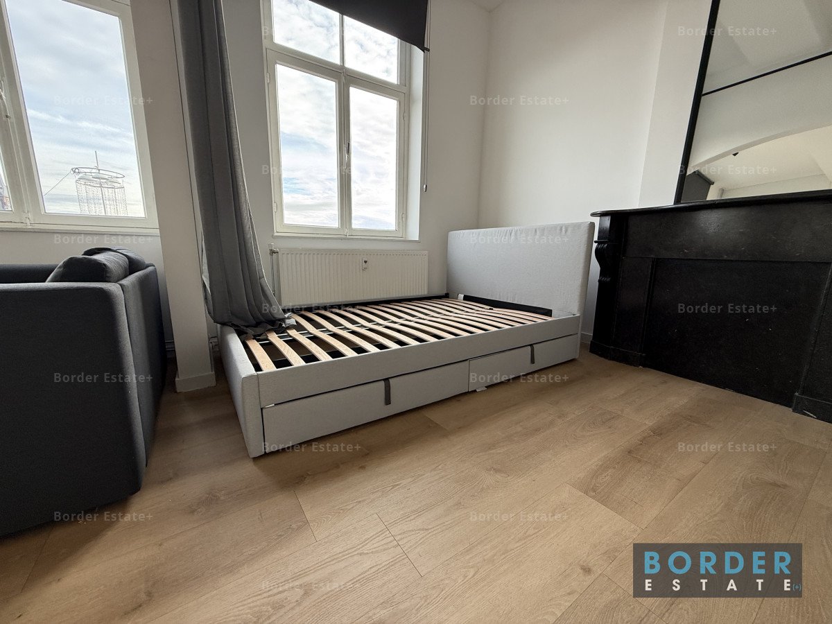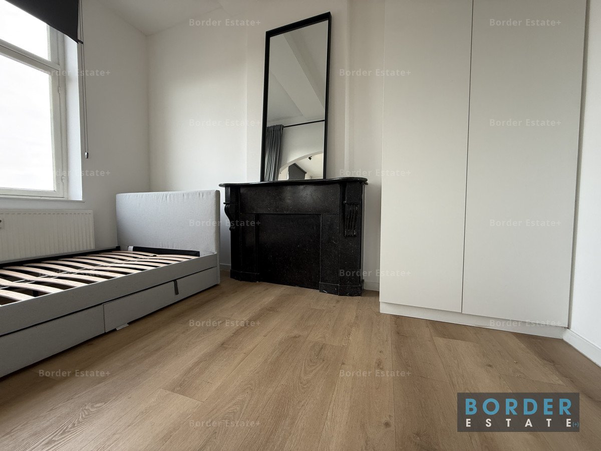 Through a graceful archway, you enter the sleeping area, complete with a double bed, spacious wardrobe, and a classic marble fireplace with mirror that adds character and elegance. The modern bathroom features a spacious shower, vanity unit, and toilet. A shared washing machine and dryer are also available in the building.