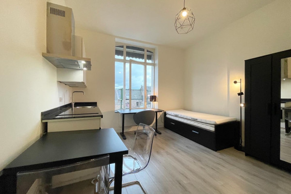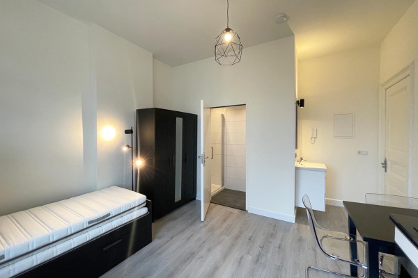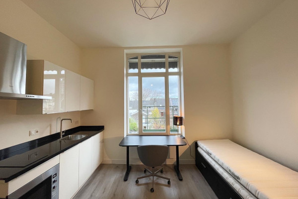 The studio is part of a characteristic monumental building (Energy Label B), combining historic charm with contemporary comfort. You will enjoy your own modern kitchen equipped with built-in appliances, a private bathroom with shower, toilet and washbasin, and a furnished sleeping/living area that is ready to move in.